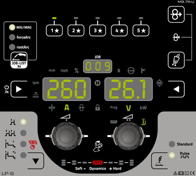 Сварочные характеристики Synergic для стандартной или импульсной сварки MIG/MAG стали / хромоникелевых сплавов / алюминия